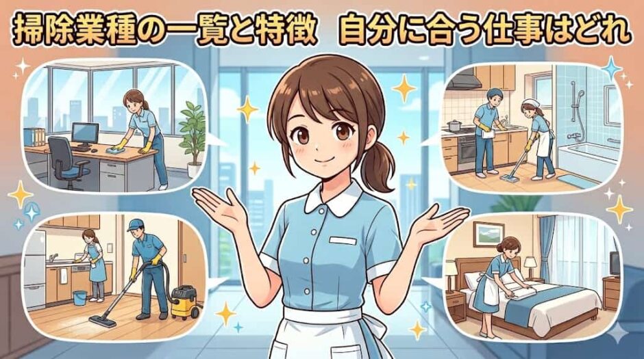 一口に「掃除の仕事」と言っても、ビルの清掃から特殊清掃、ハウスクリーニングから遺品整理まで、実は非常に多様な業種が存在します。この記事では、掃除に関わる業種の全体像・仕事内容・収入・向いている人・就業方法まで、一つひとつわかりやすく解説します。